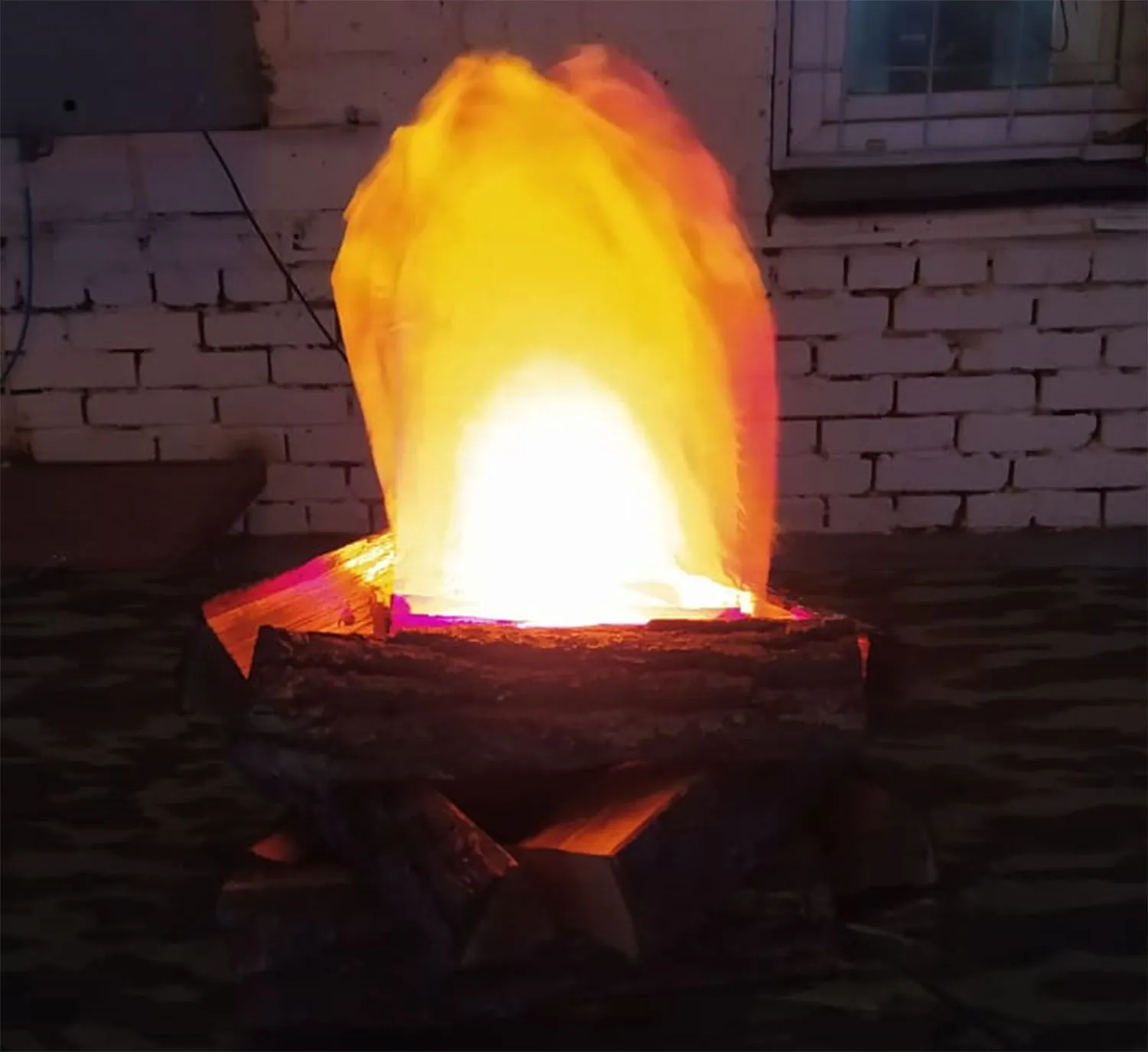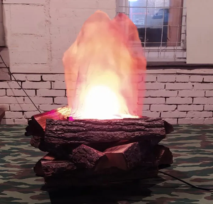 Принцип работы изделия крайне прост: кусок ткани (два куска тончайшего шелка) крепятся над небольшим вентилятором. Цветные светодиодные лампочки освещают ткань, развевающуюся в направленном потоке воздуха вентилятора. Сочетание движущейся над костром ткани и цветной LED-подсветки создаёт на сцене весьма реалистичный эффект пламени…