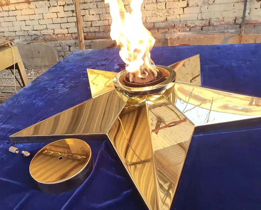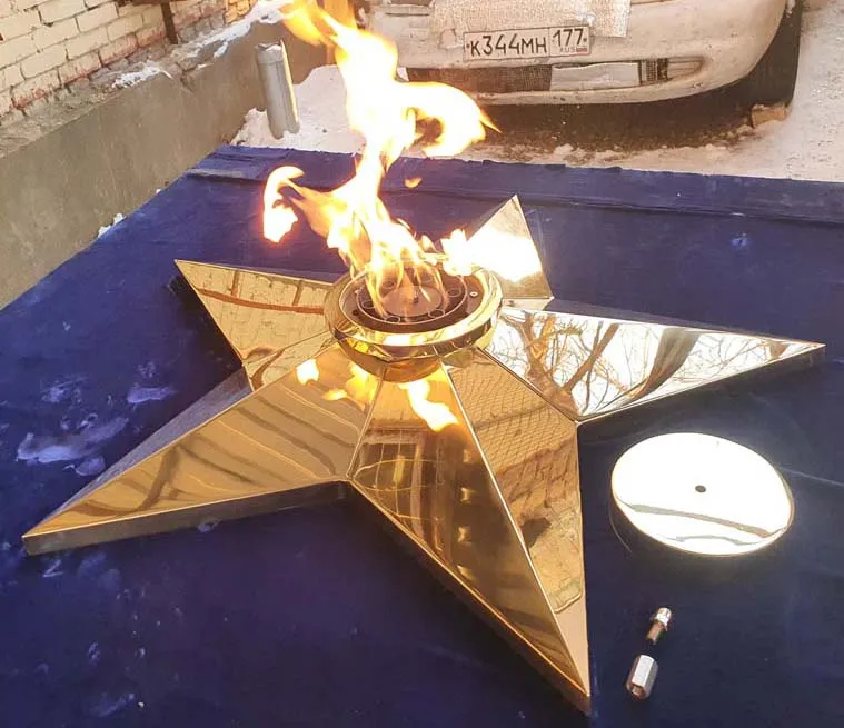 Звезда вечного огня из листовой латуни латуни марки Л63. Толщина листового металла 3не меньше чем 3 миллиметра. Диаметр звезды вечного огня 1100 миллиметров, высота пол центральной оси 140 миллиметров. Звезду характеризует удобный монтаж - на декоративную плиту сначала крепится установочная пластина через отверстия по периметру, затем через  горловину производится монтаж самой звезды.  И только затем в горловину звезды устанавливается газовая горелка. Пламя горелки горит над верхним срезом звезды, что позволяет уберечь корпус звезды от повреждений огнём. Комплектуется звезда ветроустойчивой газовой горелкой серии ГВД 379 10 89 00 ПС
